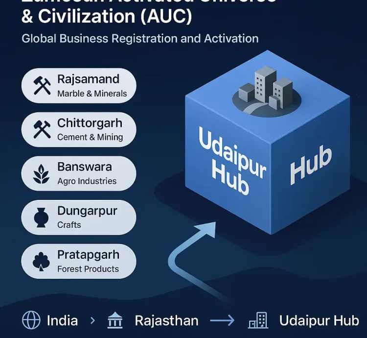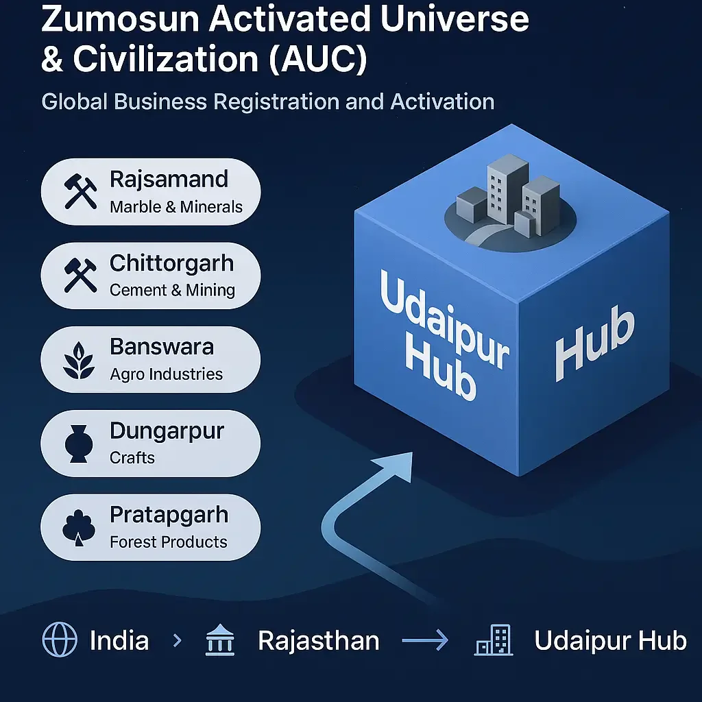 Udaipur, the City of Lakes, is not only India’s top heritage tourism destination — it is also Rajasthan’s marble, mining, and agro-industrial hub. With Zumosun Activated Universe & Civilization (AUC), your business can Start, Activate & Evolve across Udaipur and its connected districts: Rajsamand, Chittorgarh, Banswara, Dungarpur, and Pratapgarh.